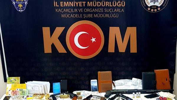 Operasyonda 53 bin 650 lira, 110 Euro, bin 100 dolar, 1 kilo 303 gram altın, 1 pompalı tüfek, 7 ruhsatsız tabanca, çok miktarda banka kartı, çek, senet, noter sözleşmeleri, çeşitli evrak ve bir miktar uyuşturucu ele geçirildi. Şüphelilerin emniyetteki işlemleri devam ediyor.